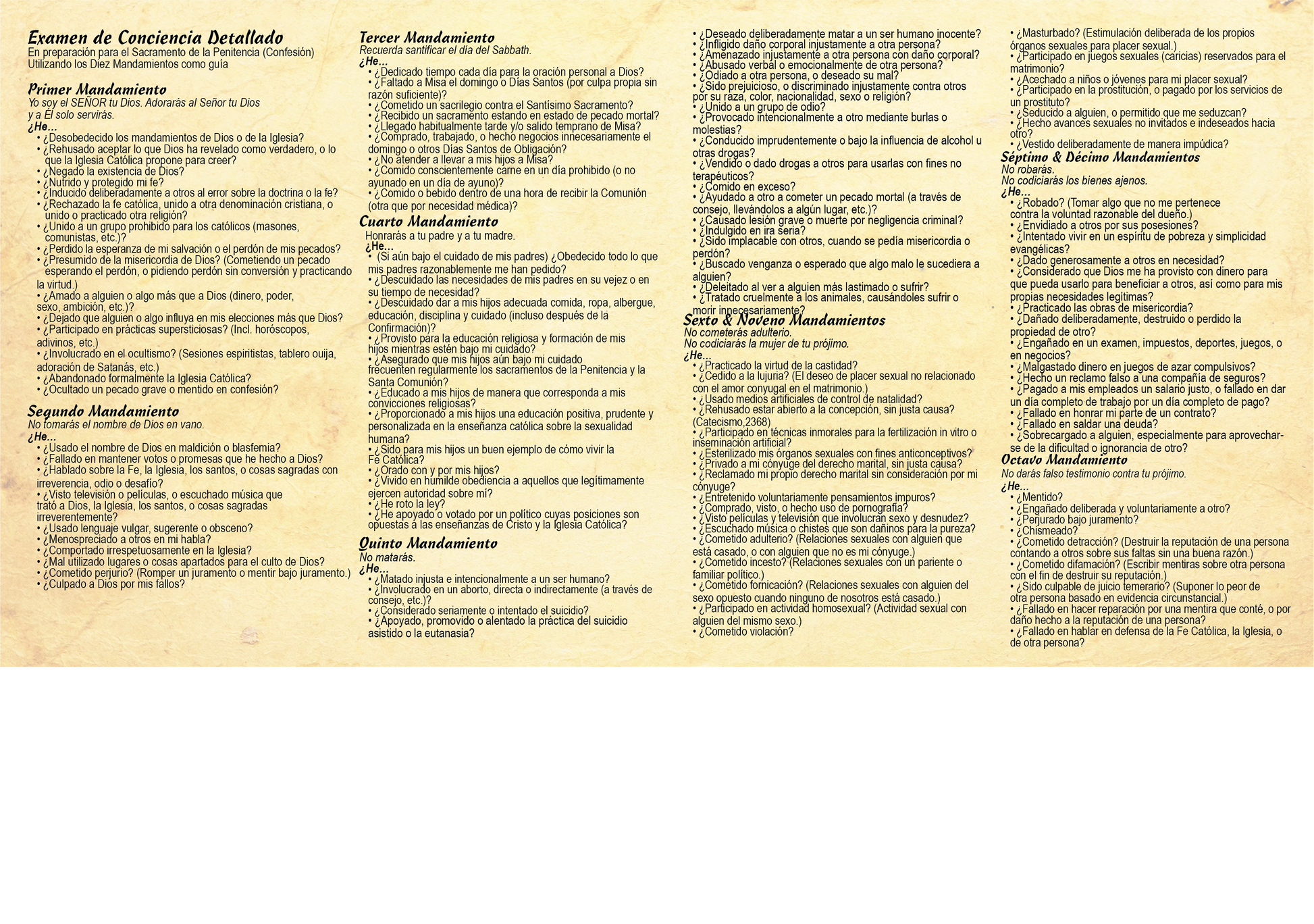 Esta tarjeta de oración de 4 paneles incluye un Examen de Conciencia Detallado, ideal para la preparación para el Sacramento de la Penitencia (Confesión). El contenido se basa en los Diez Mandamientos y contiene gran detalle.
