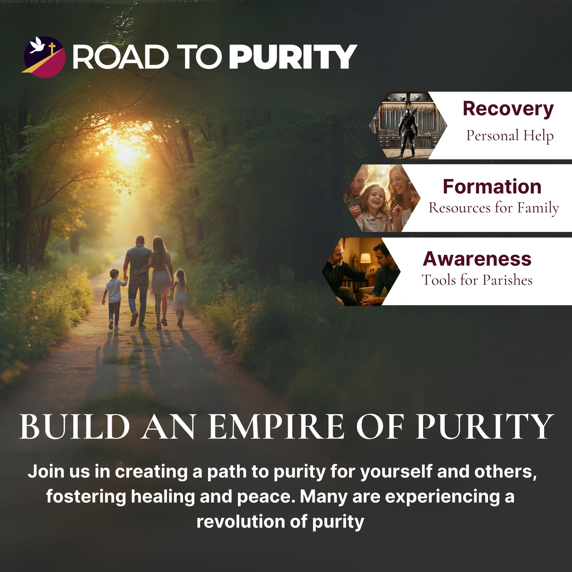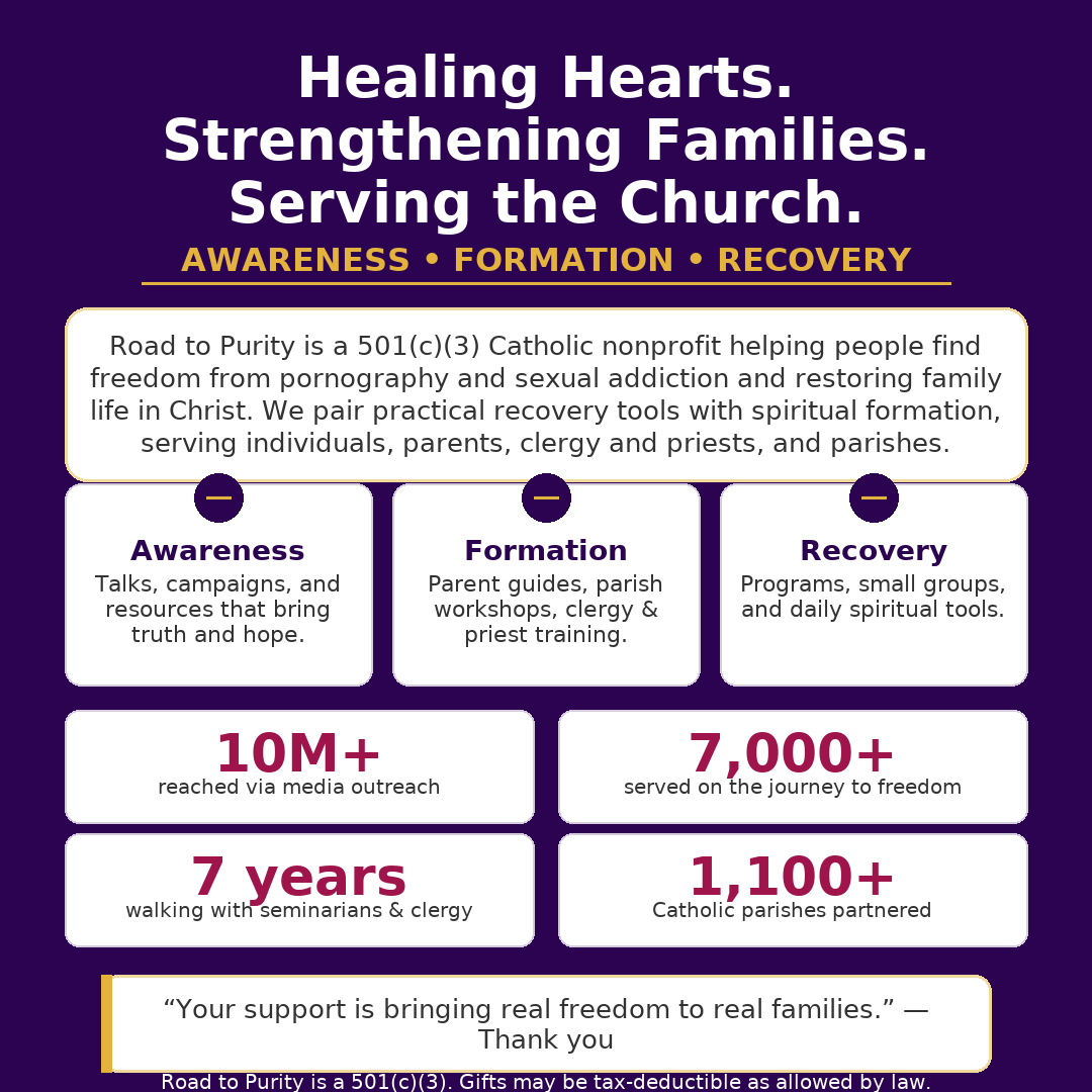 Road to Purity is a 501(c)(3) Catholic nonprofit on mission to heal wounded hearts, strengthen families, and equip the Church—through formation, recovery tools, and awareness rooted in Christ.