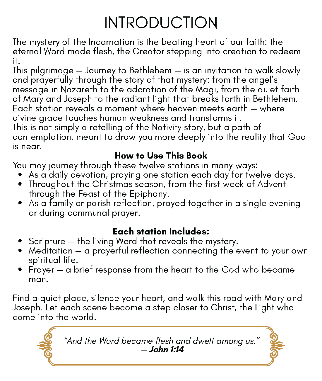 Perfect for individual reflection, family devotion, or parish prayer, Journey to Bethlehem is a companion for Advent, Christmas, and beyond — a sacred path to encounter the Word made flesh and to let His light be born anew in you.
