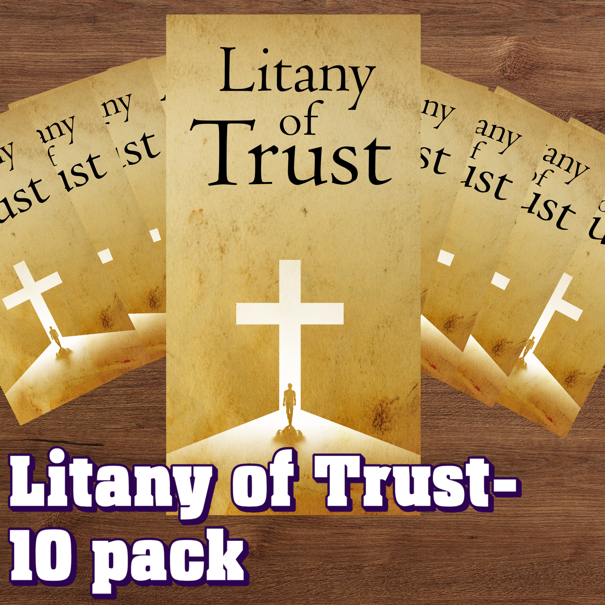 This Litany of Trust prayer card is printed on heavy card stock with a laminate finish. Folded size is 3" x 6".