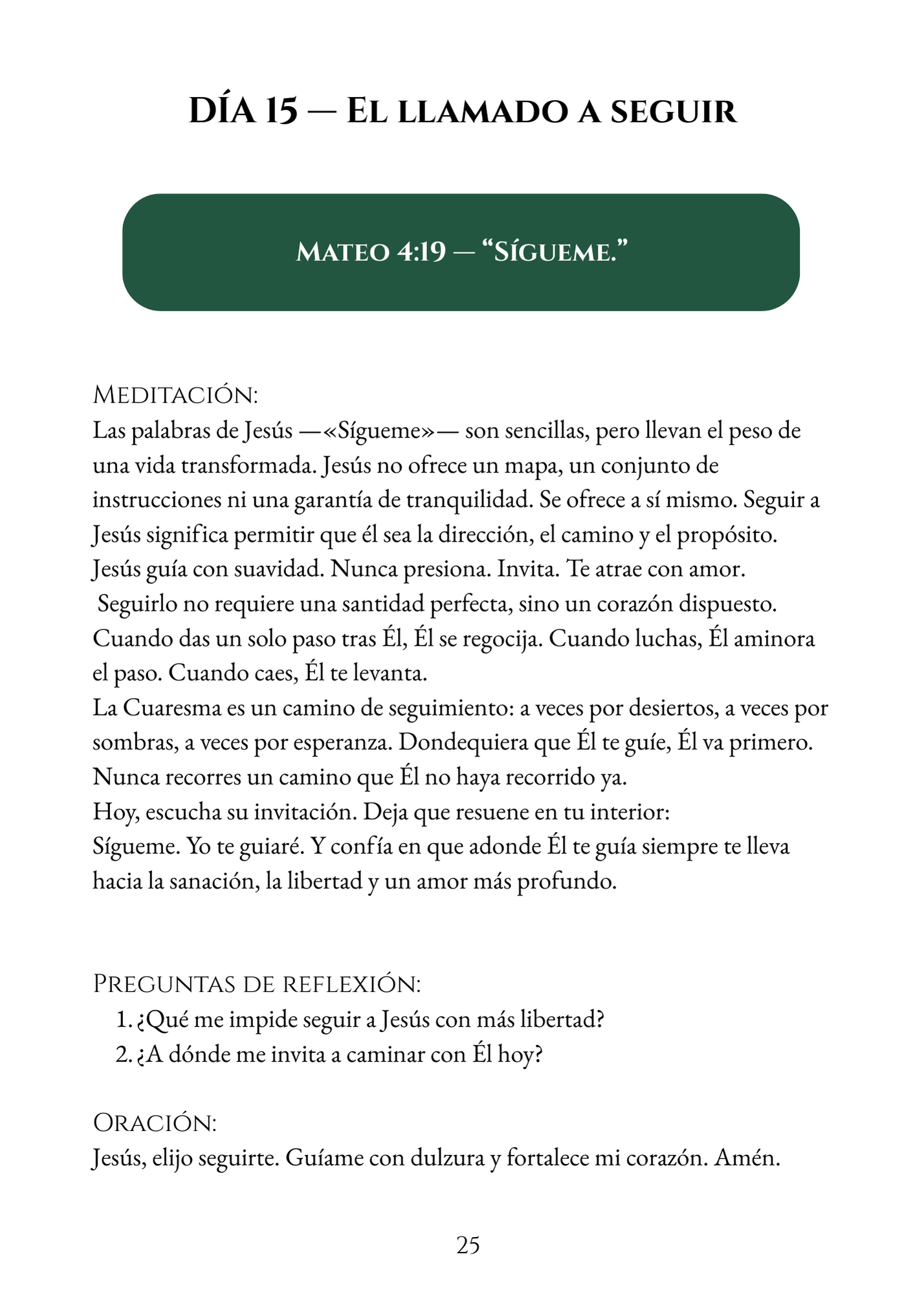 Cada día ofrece un ritmo cuidadosamente elaborado de las Escrituras, una meditación contemplativa, preguntas para reflexionar y una oración final. Juntos, estos elementos crean un espacio para la introspección sincera, la sanación personal y un encuentro renovado con la misericordia de Cristo. Este no es simplemente un libro para leer, sino una guía para orar, diseñada para acompañarte en los momentos de tranquilidad donde Dios habla con mayor claridad.