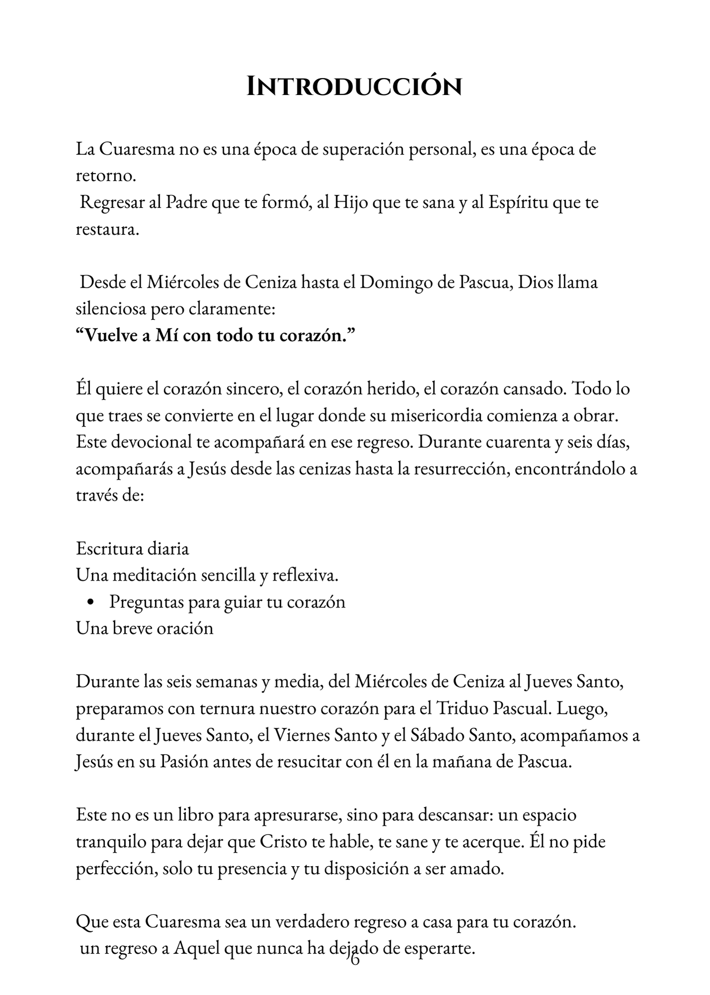Durante la Cuaresma, Regresa a Mí te ayuda a entrar más plenamente en la llamada a la conversión, preparando tu corazón para los misterios salvadores de la Pasión. El viaje se profundiza a medida que el libro te lleva a los días sagrados del Triduo Pascual, ofreciendo un contexto más rico y meditaciones enfocadas para el Jueves Santo, Viernes Santo, Sábado Santo y Domingo de Pascua, guiándote desde el sacrificio y la entrega hacia la alegría de la Resurrección.