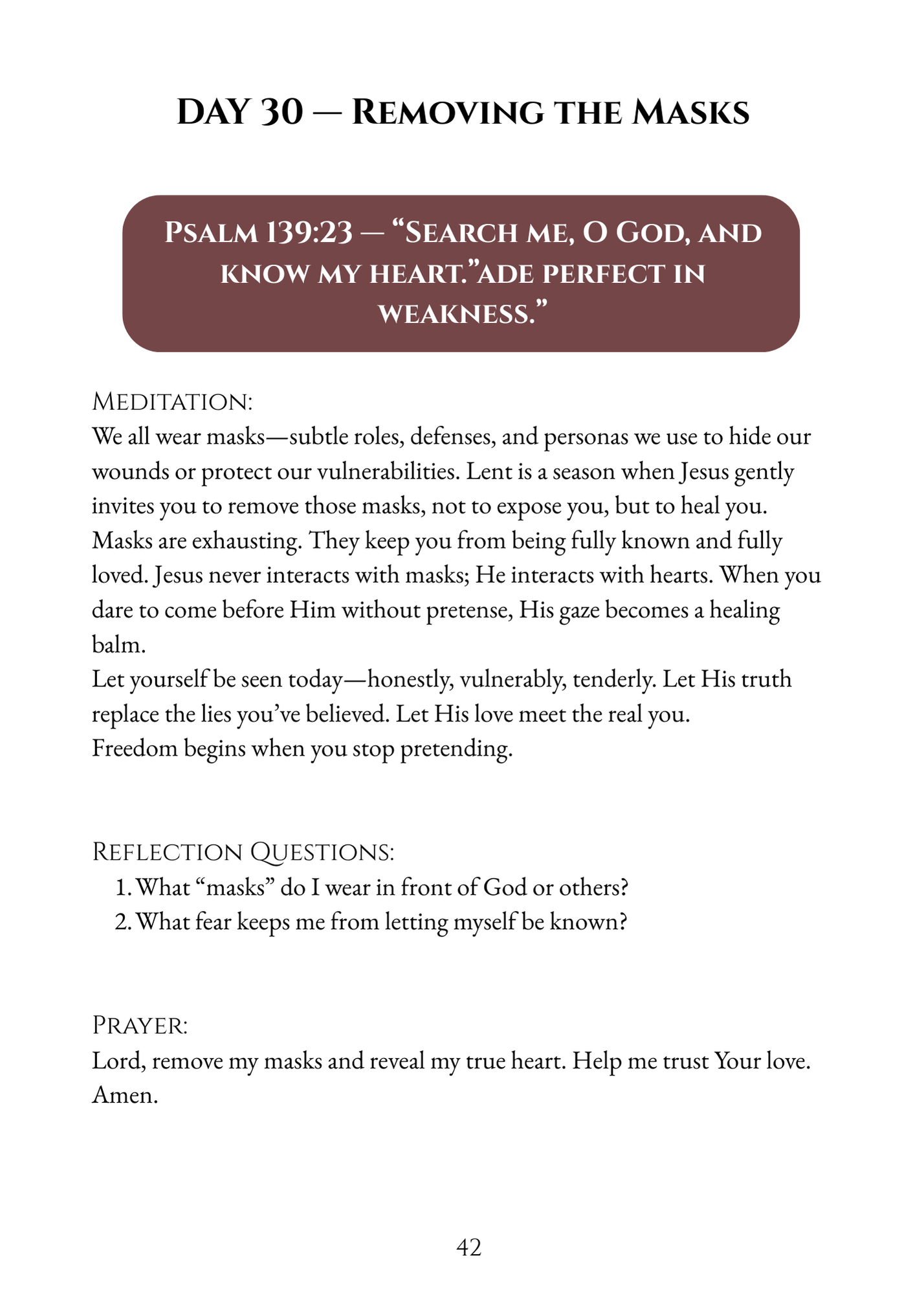 Each day offers a carefully crafted rhythm of Scripture, a contemplative meditation, thoughtful reflection questions, and a closing prayer. Together, these elements create space for honest self-examination, personal healing, and a renewed encounter with Christ’s mercy. This is not simply a book to read, but a guide to pray with—designed to meet you in the quiet moments where God speaks most clearly.